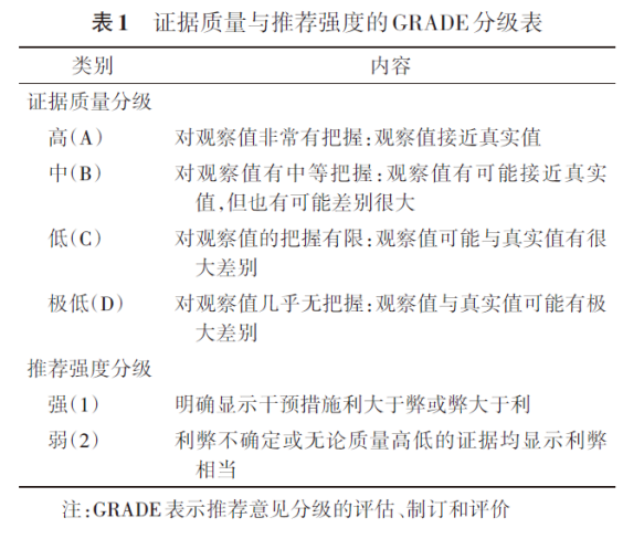 本指南使用推荐意见分级的评估、制订和评价(GRADE)方法对证据体和推荐意见进行分级,见表1。